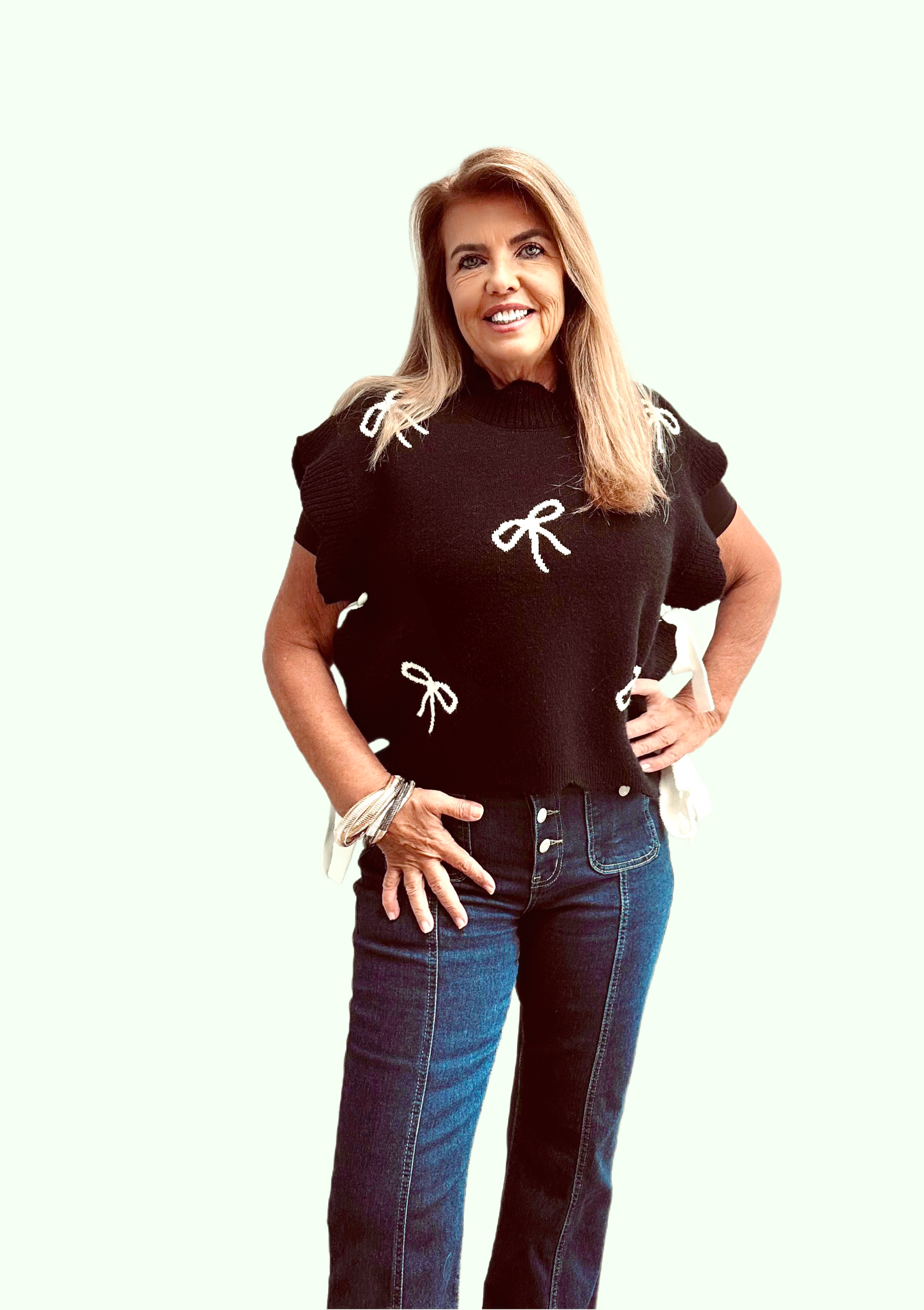 This BOW PRINT KNIT SCALLOPED VEST WITH SIDE BOW is a charming addition to your wardrobe, perfect for the Fall and Winter seasons.