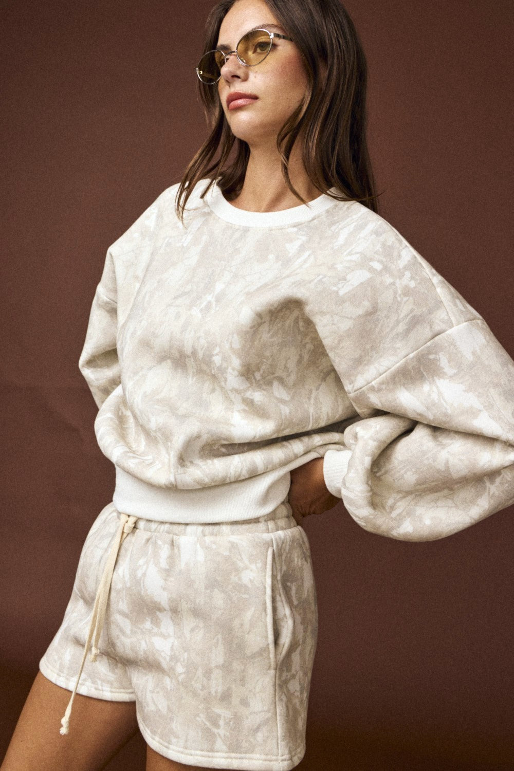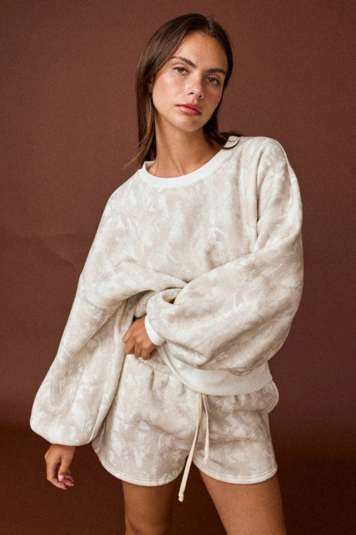 Get ready to relax in style with this cute camo crewneck sweatshirt and shorts set! The oversized sweatshirt features comfy ribbed trim, while the high-waisted drawstring shorts offer an adjustable fit. Crafted from soft washed fabric, this set is perfect for casual days, travel adventures, or weekend chilling. Embrace laid-back vibes with a playful twist!