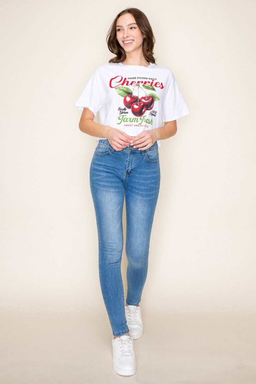 Stay fresh and trendy this summer with our Cherries Farm Fresh Graphic Crop Top! Made from 100% cotton, this white t-shirt features a fun cherry graphic that adds a playful touch to any outfit. Stay stylish and comfortable with this must-have summer essential.