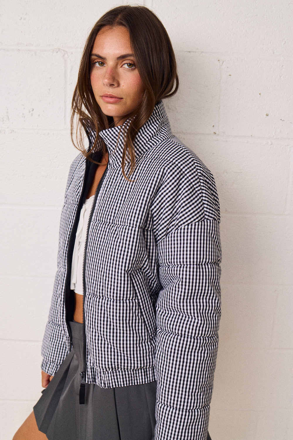 Stay cozy in style with this playful gingham zip-up puffer jacket. Featuring a timeless black and white gingham check pattern, it’s designed with a high collar and a smooth zip-up front for easy layering. Lightly padded, it offers warmth without the bulk—perfect for those breezy days when you want to look cute and stay snug.