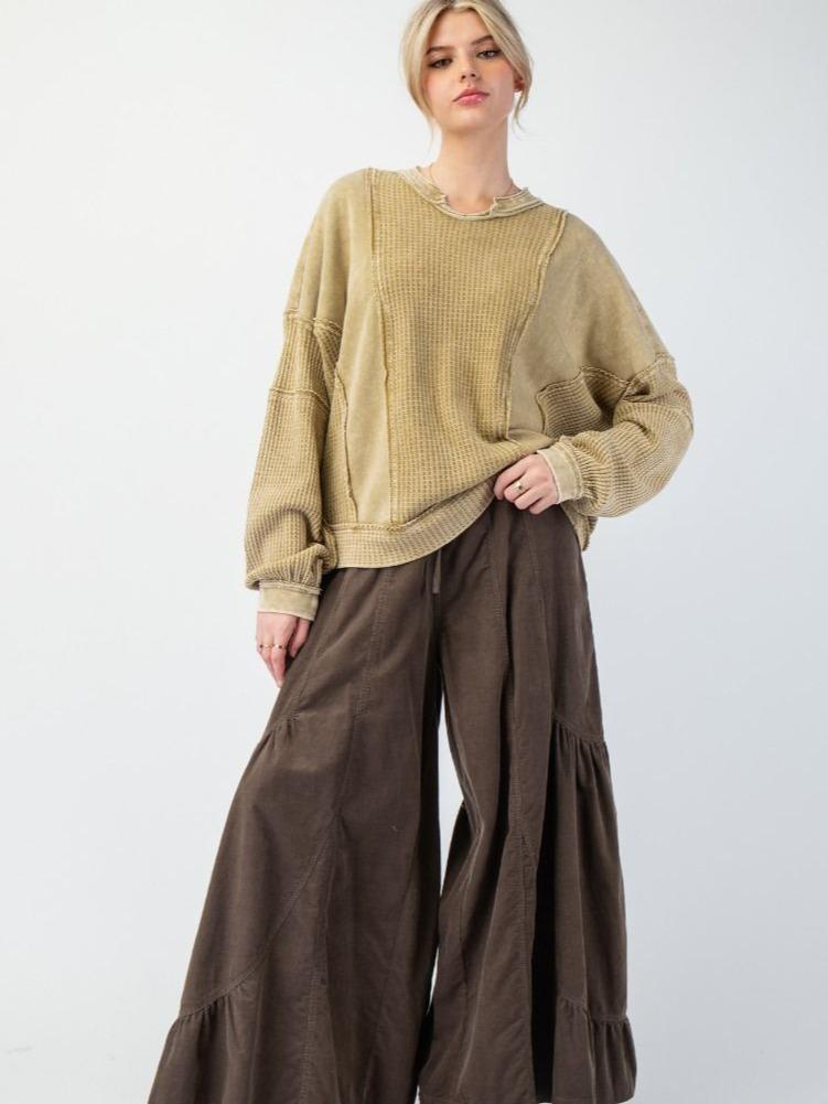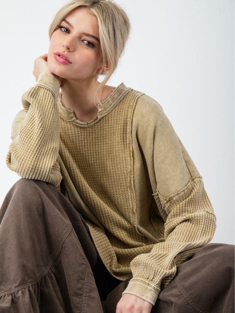 This Olive Oil Washed Thermal Mix Terry Knit Top is a must-have addition to your casual wardrobe. With its long sleeves, dropped shoulders, and relaxed fit, it offers both style and comfort.