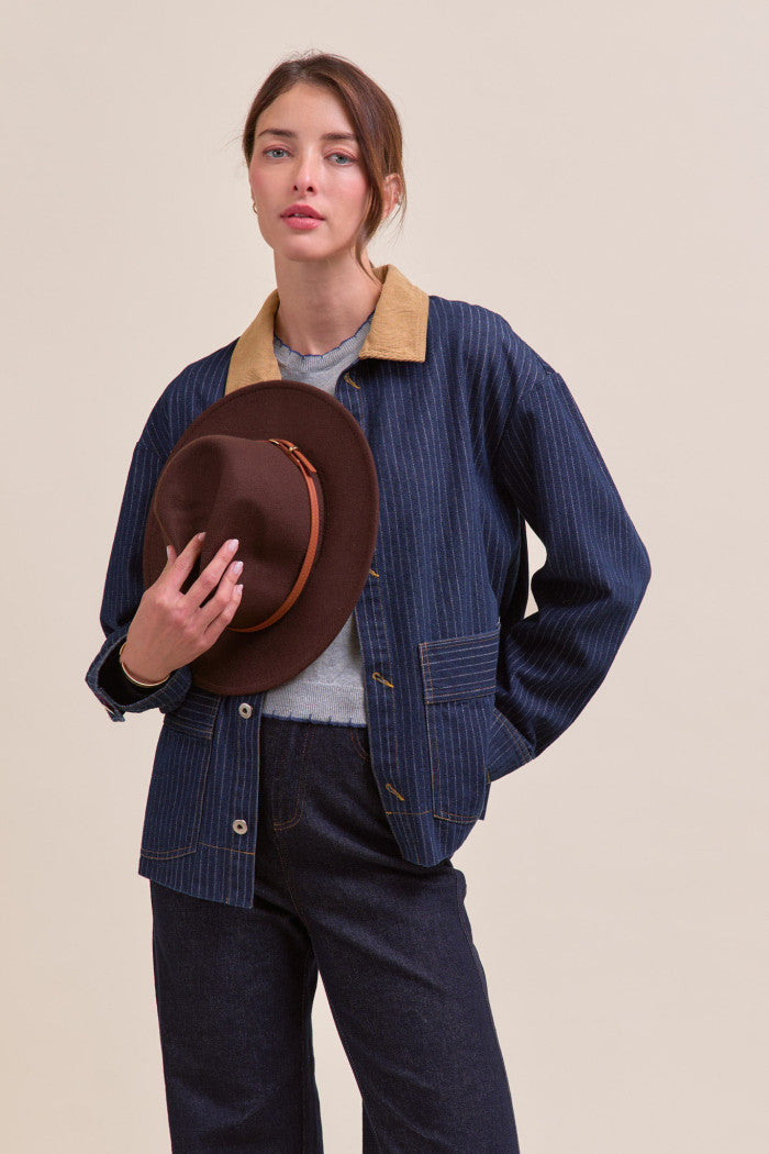 Elevate your wardrobe with this versatile pinstripe denim jacket—the ultimate layering essential for any season. Crafted from quality denim with a striking contrast corduroy collar, this oversized silhouette offers effortless style and comfort. Silver button closure and buttoned cuffs on the long sleeves add refined detail, while generous pockets keep your hands free. The relaxed fit drapes beautifully over any outfit, making it the perfect piece to reach for when you want polished, casual sophistication.