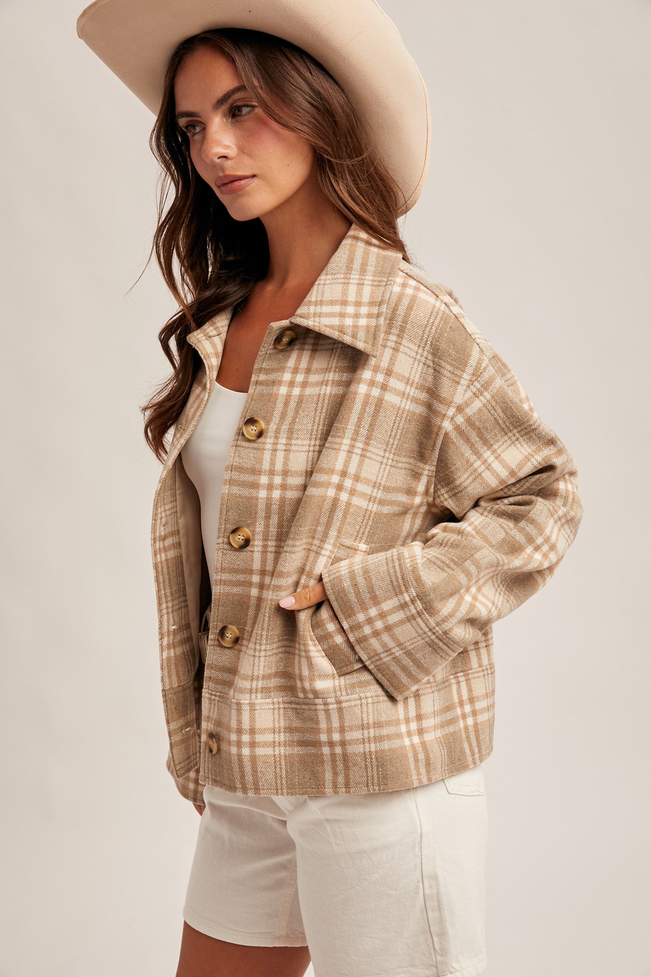 This taupe plaid button-down jacket offers both style and comfort for fall and winter. Featuring dropped shoulders for a relaxed fit, it’s fully lined to keep you cozy on chilly days. Practical front pockets add convenience, making it a versatile layering piece that complements any seasonal wardrobe.