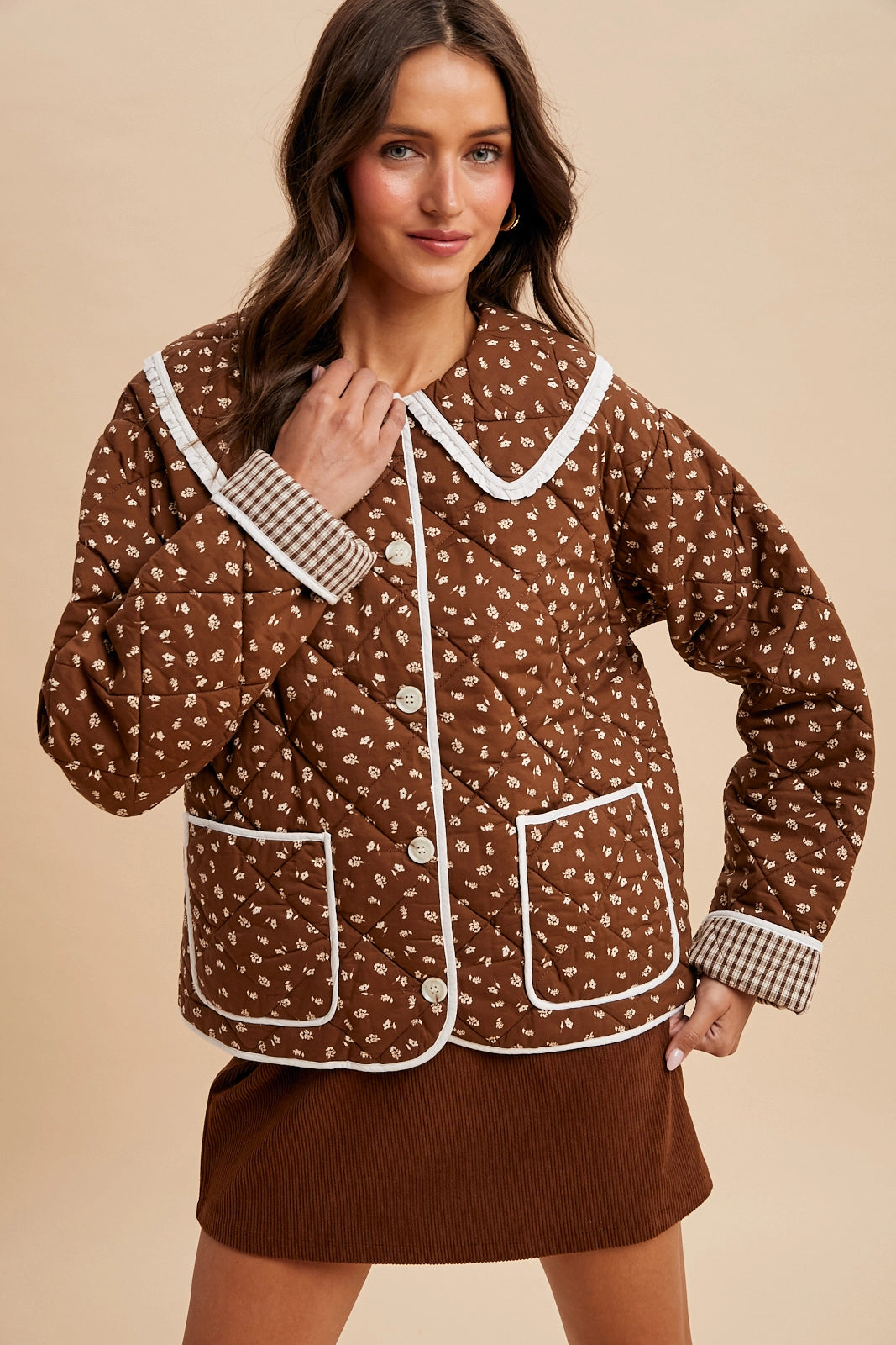 This chestnut quilted puffer jacket combines cozy warmth with charming style. Featuring a darling floral cotton print and a doll collar with delicate ruffled edges, it adds a touch of sweetness to any outfit. Fully lined with soft plaid cotton fabric, this jacket ensures comfort and quality wear through cooler days. A perfect blend of function and feminine appeal.